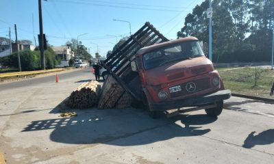 Camión volcó su carga de madera tras la rotura de la rueda trasera.